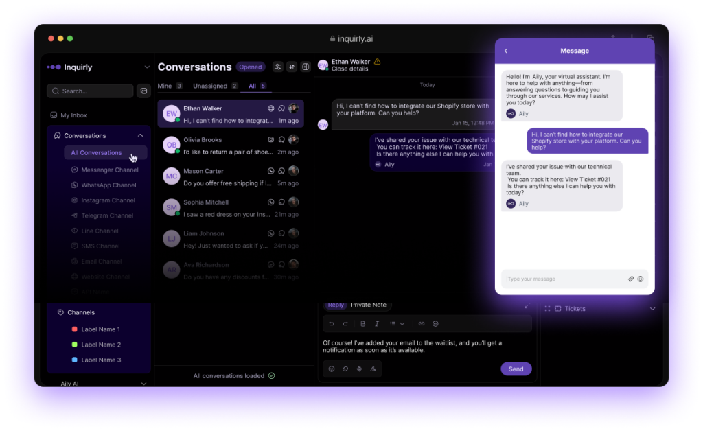 Whether through chat, email, or social channels, every question, request, or concern automatically becomes a trackable ticket in Inquirly.